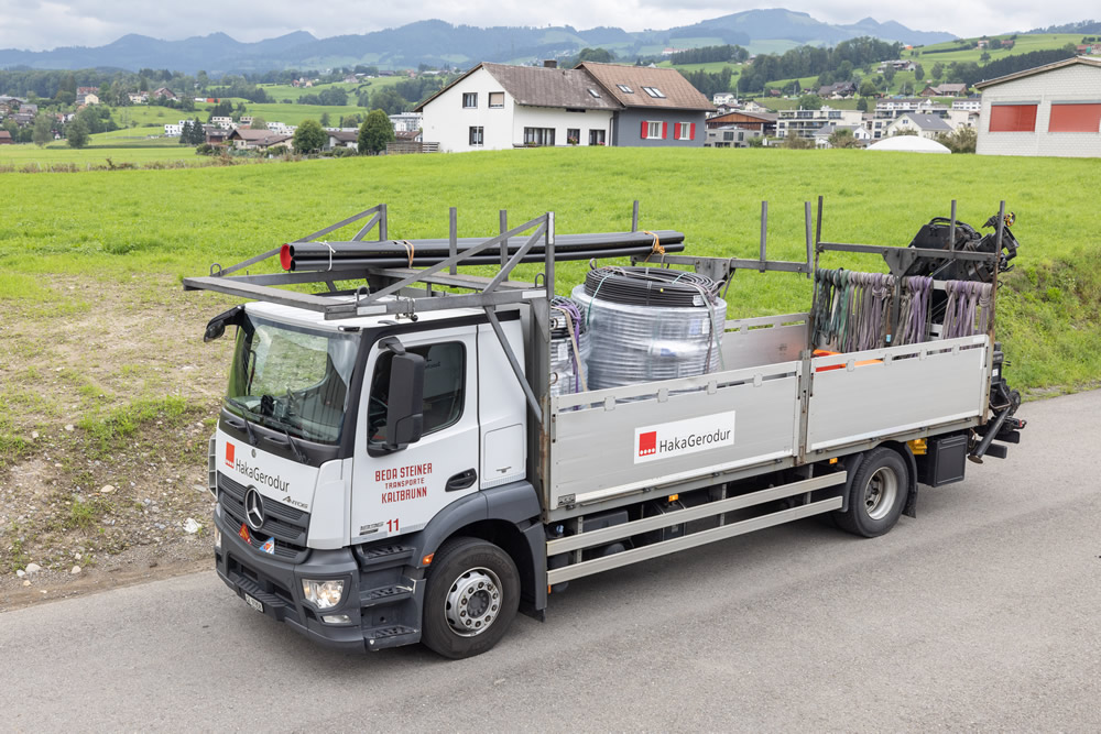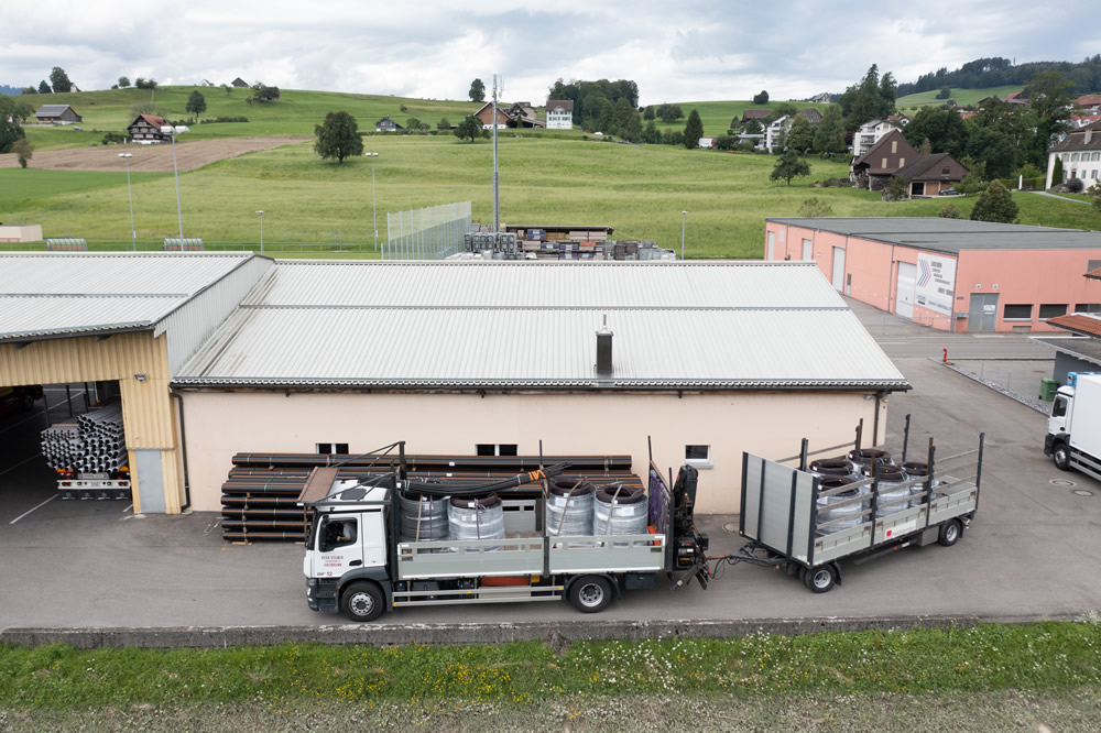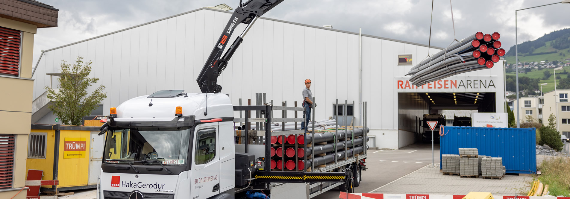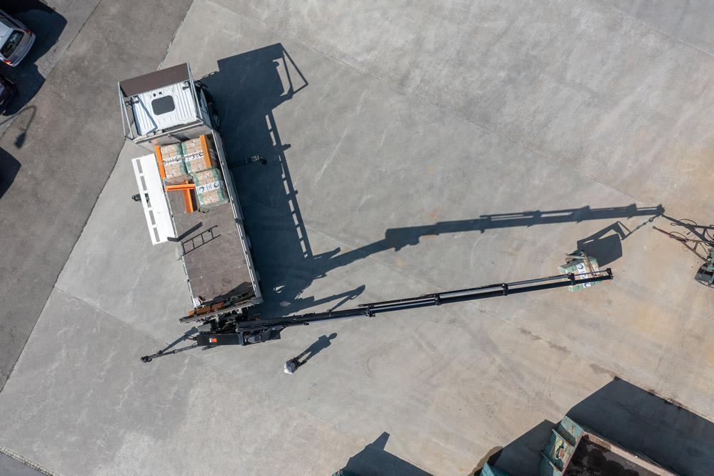 - Vielfältige Flotte: Gedeckte und offene Fahrzeuge mit Kran ermöglichen einen schonenden Transport Ihrer Güter mit punktgenauem Ablad auf der Baustelle.