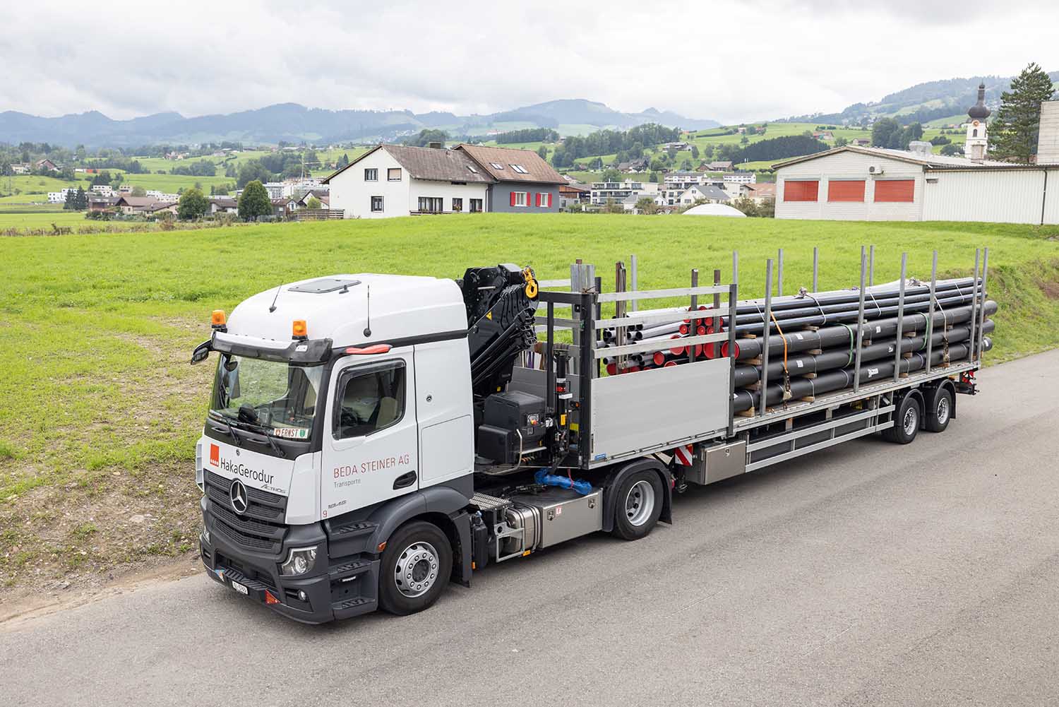 Mehr als 15 Kranfahrzeuge stehen für Sie im Einsatz. Langmaterialsattelschlepper für Produkte bis 15m Länge, Zwei- und Dreiachsfahrzeuge mit Heckkran für Güter mit bis zu 12m Länge sorgen für eine grosse Flexiblität. Für sperrige Güter, welche während dem Transport geschützt werden müssen, stehen Blachenfahrzeuge mit Kran zur Verfügung.